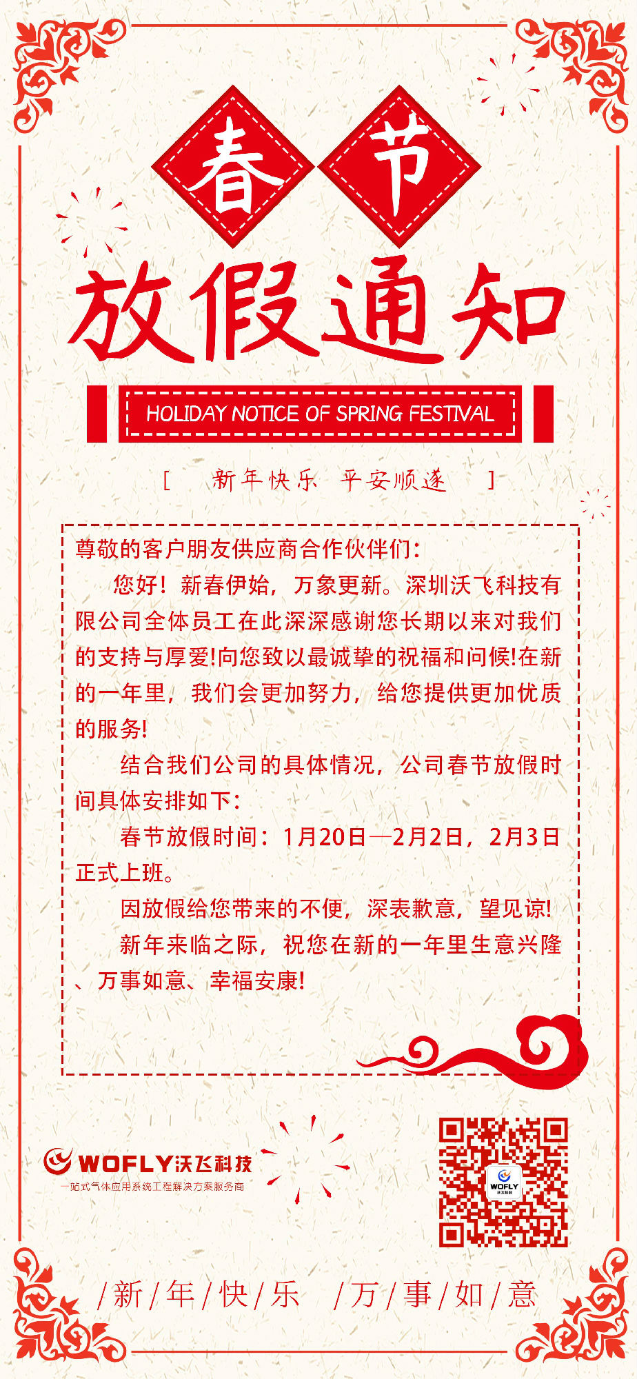 深圳沃飛科技有限公司關于2020年春節(jié)放假安排通知