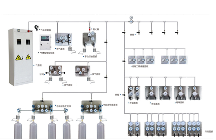 獨(dú)立氣瓶間:氫氣等易燃?xì)怏w需單獨(dú)設(shè)置氣瓶間,配備防爆電氣、通風(fēng)系統(tǒng)(換氣次數(shù)≥3次/小時(shí))及氣體泄漏報(bào)警裝置(氫氣報(bào)警閾值1%LEL)。
